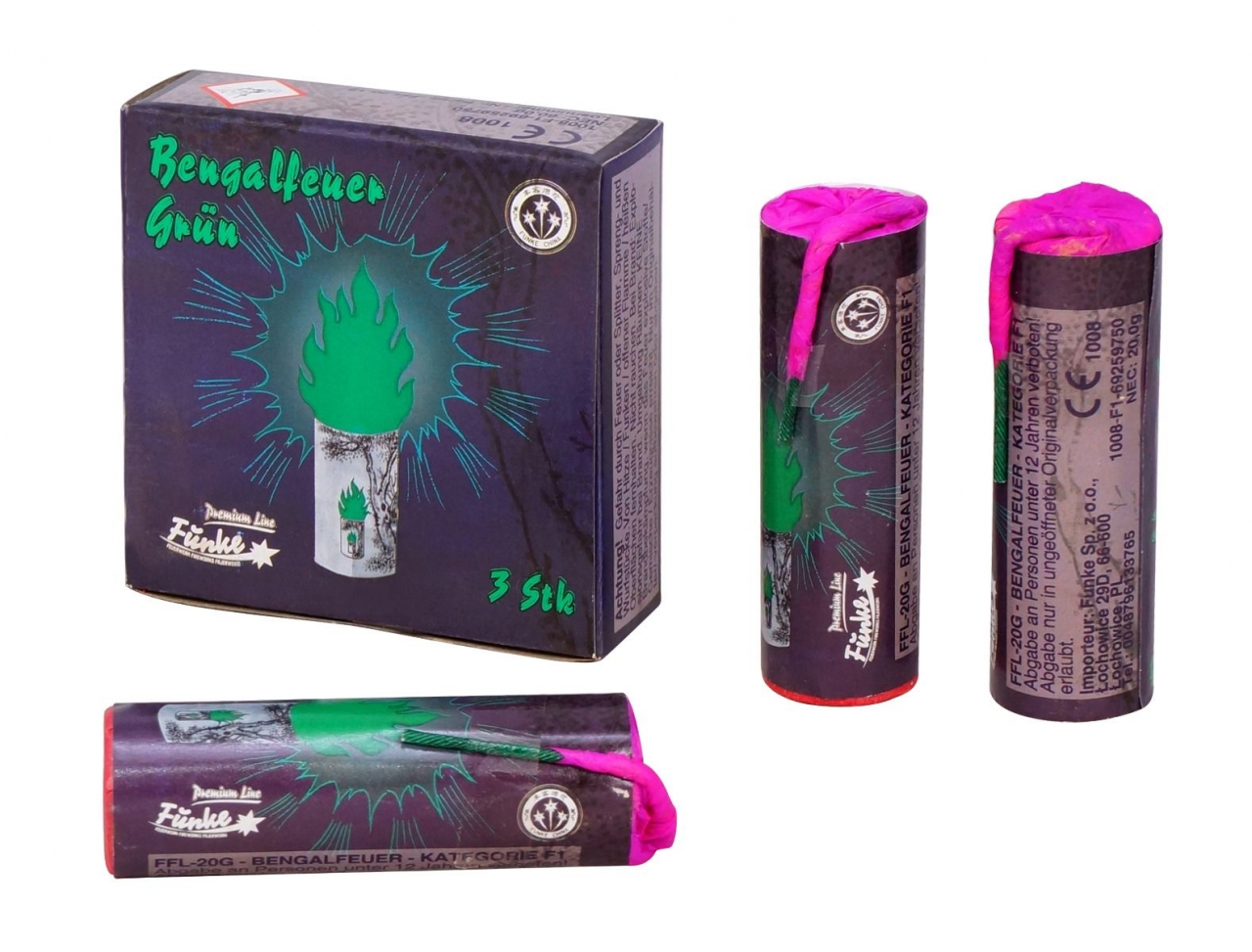 Grünes Bengalfeuer im 3er Pack. Intensive grüne Flamme mit starker Licht- und Rauchentwicklung, im kompakten Format mit der maximal in Kateorie F1 zulässigen Satzmenge von 20g und einer Brenndauer von über 20 Sekunden.